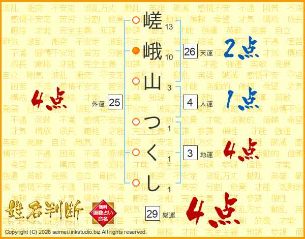 生活面を象徴する運勢です。外部から受ける影響力を表し、結婚運、家庭運や職場、環境への順応性を表します。総運から人運を引いた画数。姓や名が1文字の場合を除く。