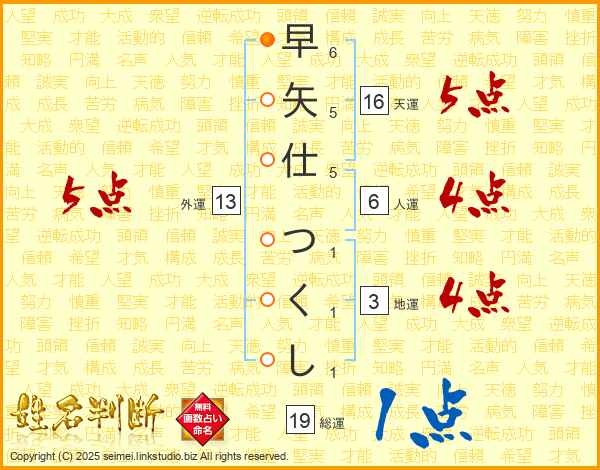 生活面を象徴する運勢です。外部から受ける影響力を表し、結婚運、家庭運や職場、環境への順応性を表します。総運から人運を引いた画数。姓や名が1文字の場合を除く。