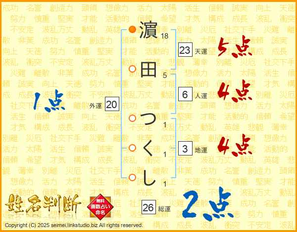生活面を象徴する運勢です。外部から受ける影響力を表し、結婚運、家庭運や職場、環境への順応性を表します。総運から人運を引いた画数。姓や名が1文字の場合を除く。