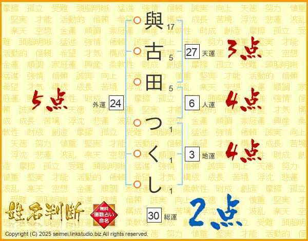 與(17画)古(5画)田(5画) つ(1画)く(1画)し(1画)