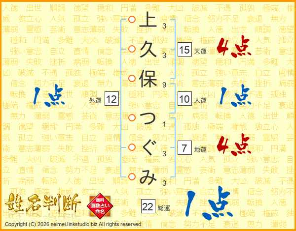上(3画)久(3画)保(9画) つ(1画)ぐ(3画)み(3画)