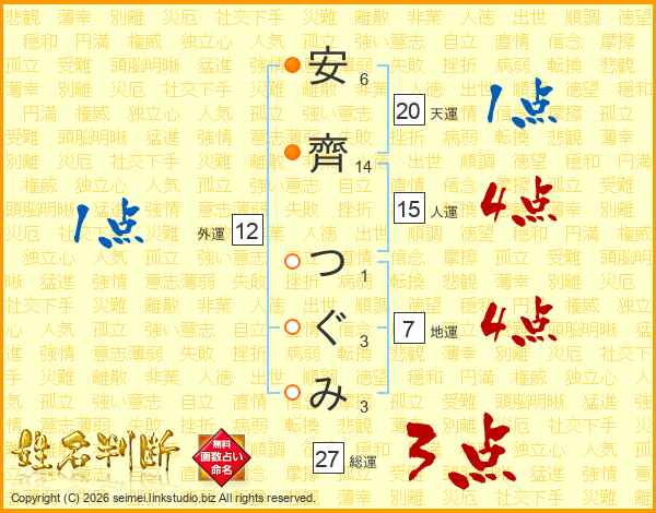 安(6画)齊(14画) つ(1画)ぐ(3画)み(3画)