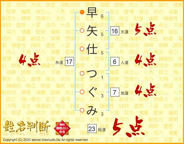 生活面を象徴する運勢です。外部から受ける影響力を表し、結婚運、家庭運や職場、環境への順応性を表します。総運から人運を引いた画数。姓や名が1文字の場合を除く。