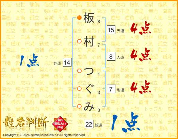 板(8画)村(7画) つ(1画)ぐ(3画)み(3画)