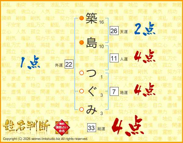 築島つぐみさんの総運は33画の4点!