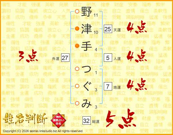野(11画)津(10画)手(4画) つ(1画)ぐ(3画)み(3画)
