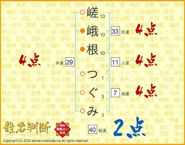 嵯(13画)峨(10画)根(10画) つ(1画)ぐ(3画)み(3画)