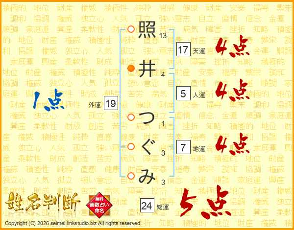 照井つぐみさんの天運は17画の4点!