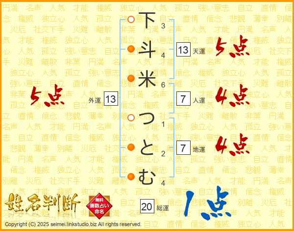 生活面を象徴する運勢です。外部から受ける影響力を表し、結婚運、家庭運や職場、環境への順応性を表します。総運から人運を引いた画数。姓や名が1文字の場合を除く。