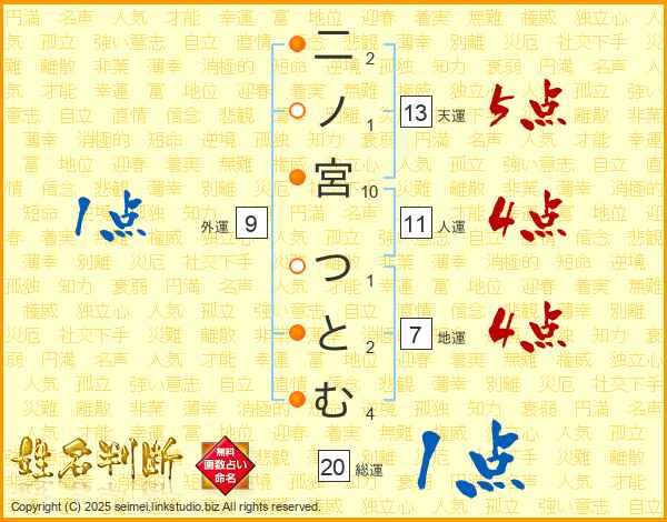 生活面を象徴する運勢です。外部から受ける影響力を表し、結婚運、家庭運や職場、環境への順応性を表します。総運から人運を引いた画数。姓や名が1文字の場合を除く。