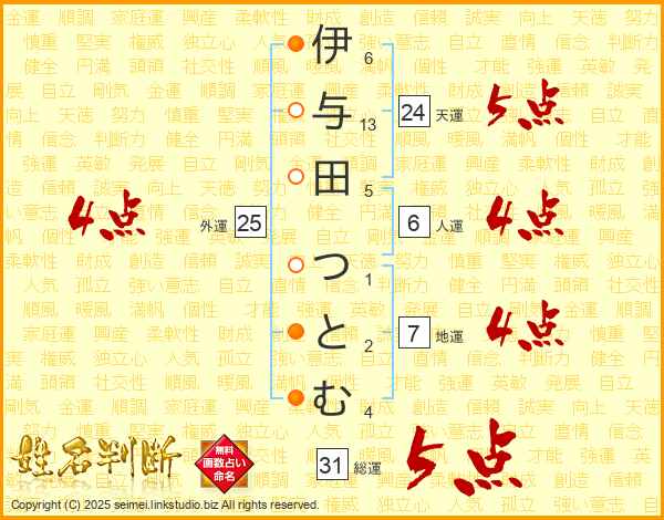 伊(6画)与(13画)田(5画) つ(1画)と(2画)む(4画)