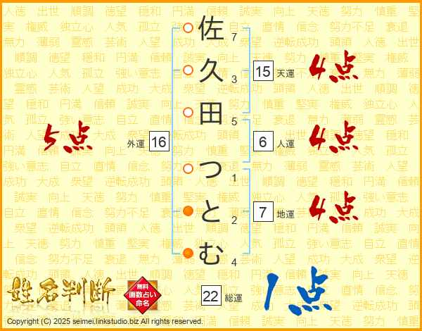 生活面を象徴する運勢です。外部から受ける影響力を表し、結婚運、家庭運や職場、環境への順応性を表します。総運から人運を引いた画数。姓や名が1文字の場合を除く。