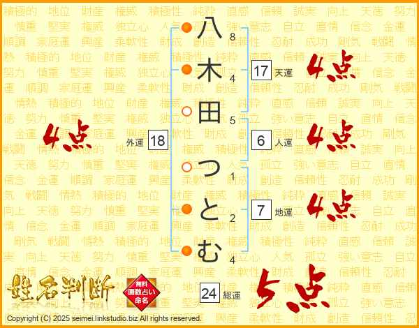 生活面を象徴する運勢です。外部から受ける影響力を表し、結婚運、家庭運や職場、環境への順応性を表します。総運から人運を引いた画数。姓や名が1文字の場合を除く。