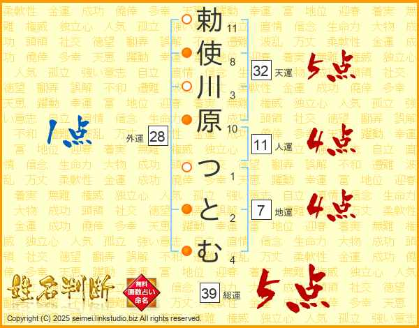 勅使川原つとむさんの総運は39画の5点!
