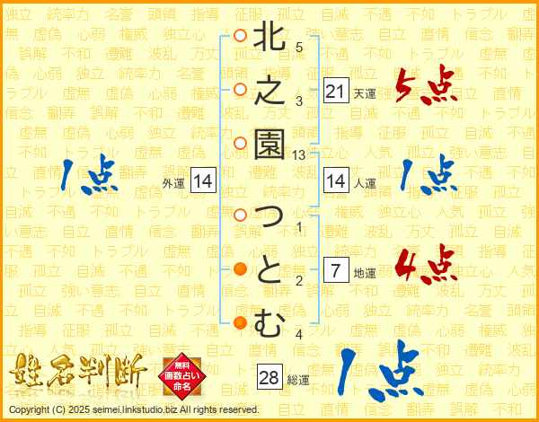生活面を象徴する運勢です。外部から受ける影響力を表し、結婚運、家庭運や職場、環境への順応性を表します。総運から人運を引いた画数。姓や名が1文字の場合を除く。