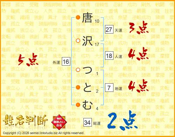 唐(10画)沢(17画) つ(1画)と(2画)む(4画)
