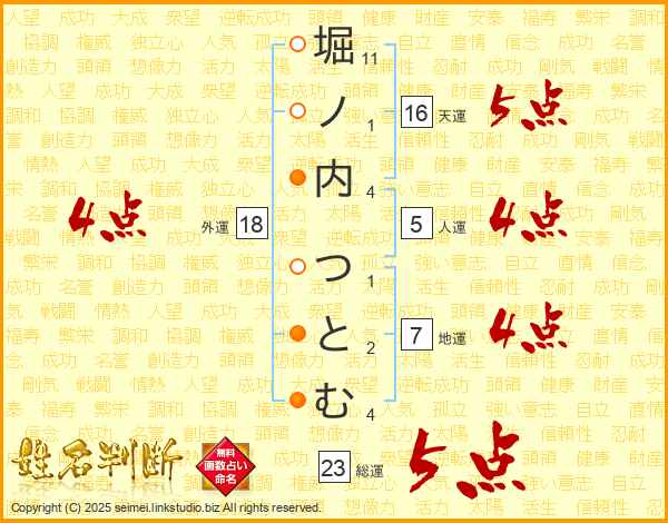 堀ノ内つとむさんの天運は16画の5点!
