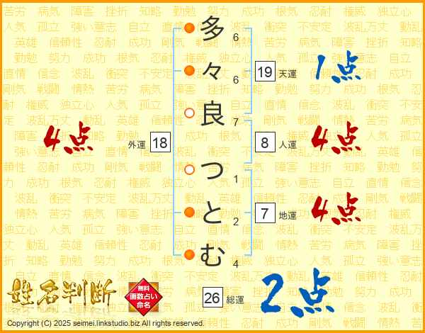 あなたの人生を表す1番重要な運勢です。生涯を通じて影響する総合運となり、主に50歳以降の晩年期に影響を及ぼします。苗字と名前の合計画数。