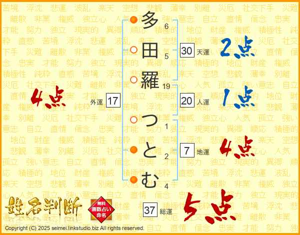 多(6画)田(5画)羅(19画) つ(1画)と(2画)む(4画)