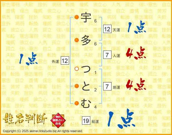 宇(6画)多(6画) つ(1画)と(2画)む(4画)