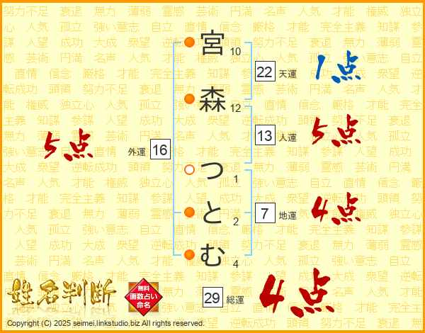 宮(10画)森(12画) つ(1画)と(2画)む(4画)