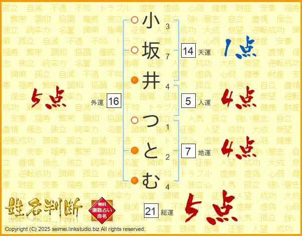 生活面を象徴する運勢です。外部から受ける影響力を表し、結婚運、家庭運や職場、環境への順応性を表します。総運から人運を引いた画数。姓や名が1文字の場合を除く。