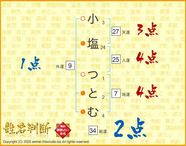小塩つとむさんの総運は34画の2点!