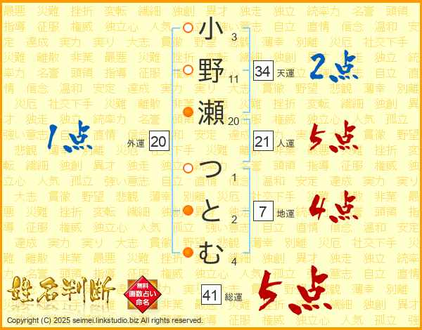 生活面を象徴する運勢です。外部から受ける影響力を表し、結婚運、家庭運や職場、環境への順応性を表します。総運から人運を引いた画数。姓や名が1文字の場合を除く。