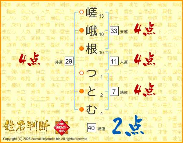 生活面を象徴する運勢です。外部から受ける影響力を表し、結婚運、家庭運や職場、環境への順応性を表します。総運から人運を引いた画数。姓や名が1文字の場合を除く。