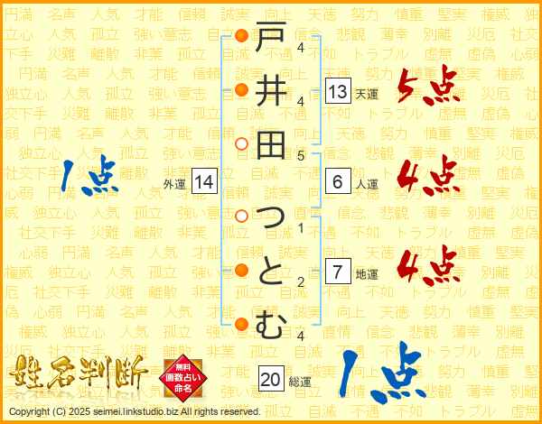 生活面を象徴する運勢です。外部から受ける影響力を表し、結婚運、家庭運や職場、環境への順応性を表します。総運から人運を引いた画数。姓や名が1文字の場合を除く。