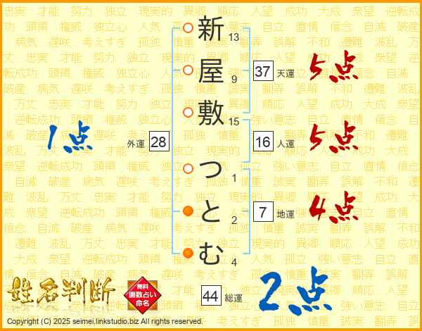 新屋敷つとむさんの天運は37画の5点!
