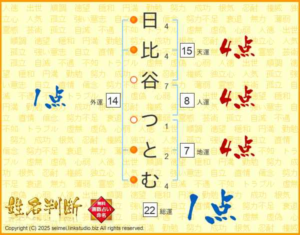 日(4画)比(4画)谷(7画) つ(1画)と(2画)む(4画)