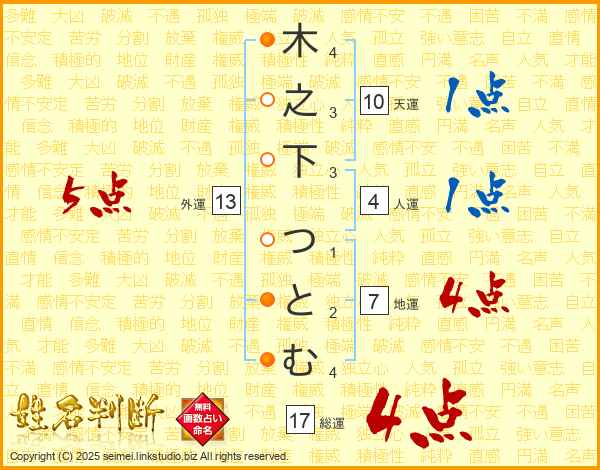 木(4画)之(3画)下(3画) つ(1画)と(2画)む(4画)