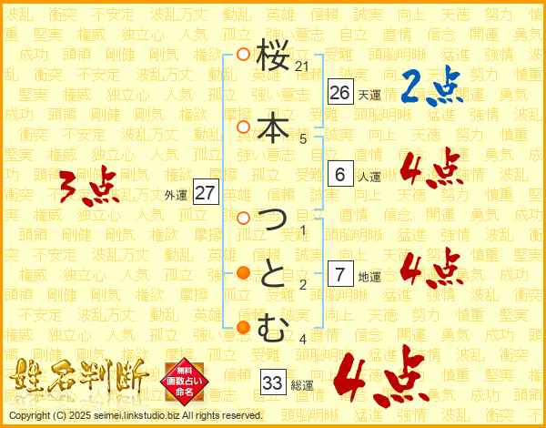 桜(21画)本(5画) つ(1画)と(2画)む(4画)