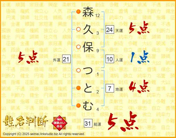 森(12画)久(3画)保(9画) つ(1画)と(2画)む(4画)
