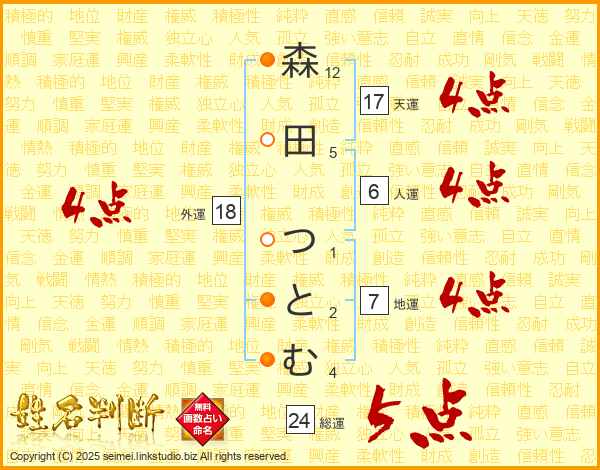 森(12画)田(5画) つ(1画)と(2画)む(4画)