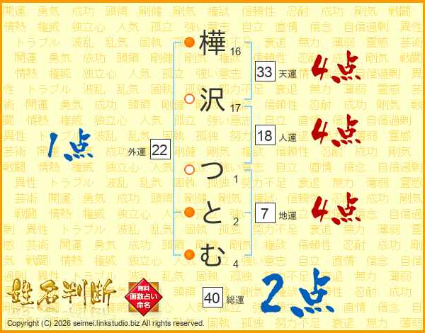 樺沢つとむさんの天運は33画の4点!
