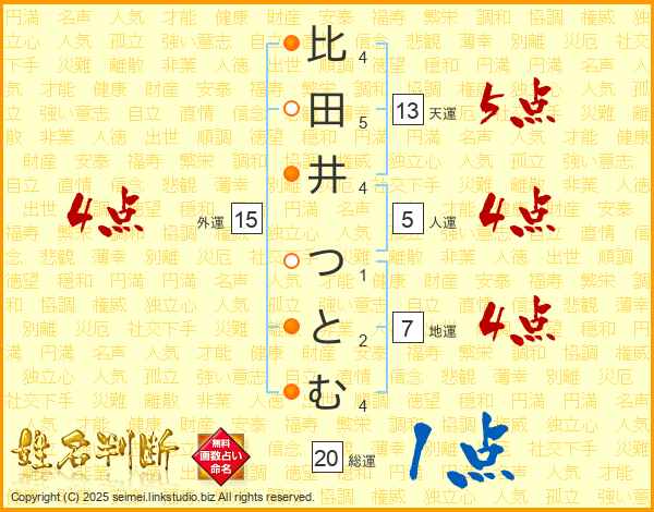 生活面を象徴する運勢です。外部から受ける影響力を表し、結婚運、家庭運や職場、環境への順応性を表します。総運から人運を引いた画数。姓や名が1文字の場合を除く。
