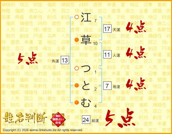 生活面を象徴する運勢です。外部から受ける影響力を表し、結婚運、家庭運や職場、環境への順応性を表します。総運から人運を引いた画数。姓や名が1文字の場合を除く。