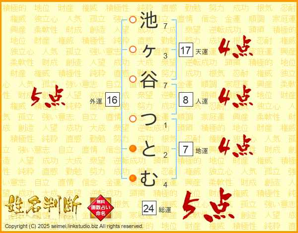 生活面を象徴する運勢です。外部から受ける影響力を表し、結婚運、家庭運や職場、環境への順応性を表します。総運から人運を引いた画数。姓や名が1文字の場合を除く。
