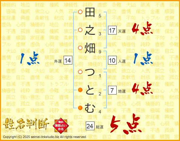 田(5画)之(3画)畑(9画) つ(1画)と(2画)む(4画)