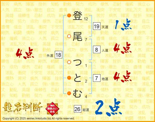 登尾つとむさんの総運は26画の2点!
