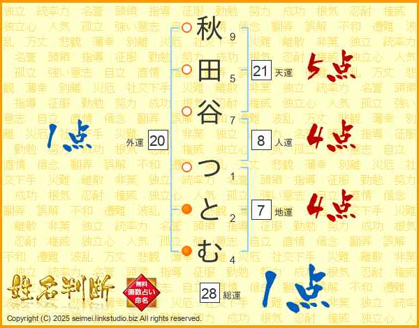 秋(9画)田(5画)谷(7画) つ(1画)と(2画)む(4画)