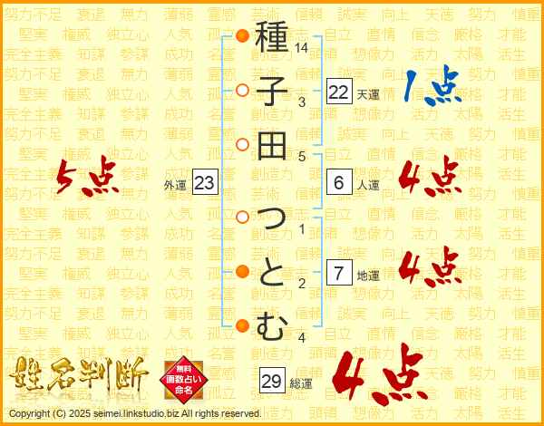 種(14画)子(3画)田(5画) つ(1画)と(2画)む(4画)