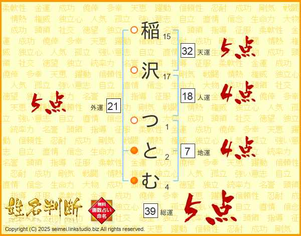 稲(15画)沢(17画) つ(1画)と(2画)む(4画)