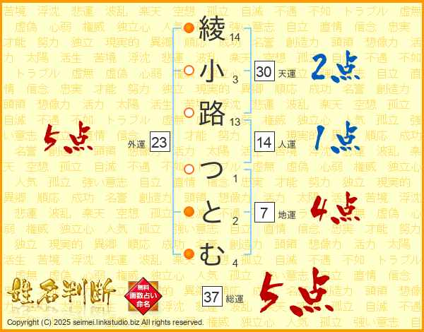綾(14画)小(3画)路(13画) つ(1画)と(2画)む(4画)
