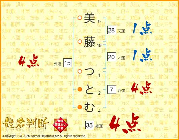 美(9画)藤(19画) つ(1画)と(2画)む(4画)