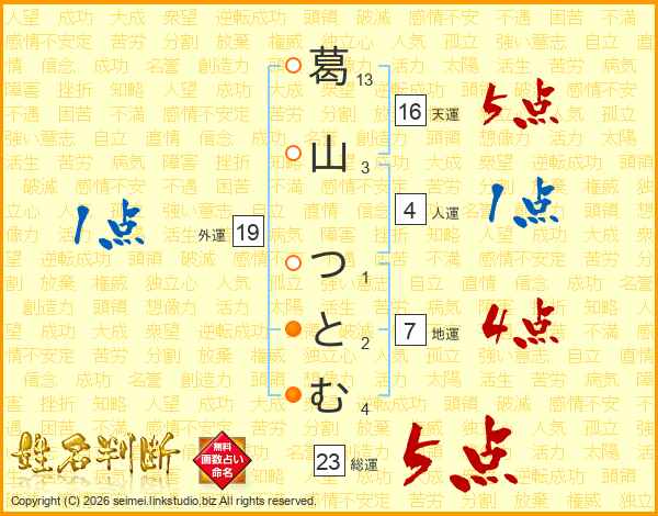 葛山つとむさんの総運は23画の5点!