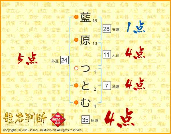 藍(18画)原(10画) つ(1画)と(2画)む(4画)