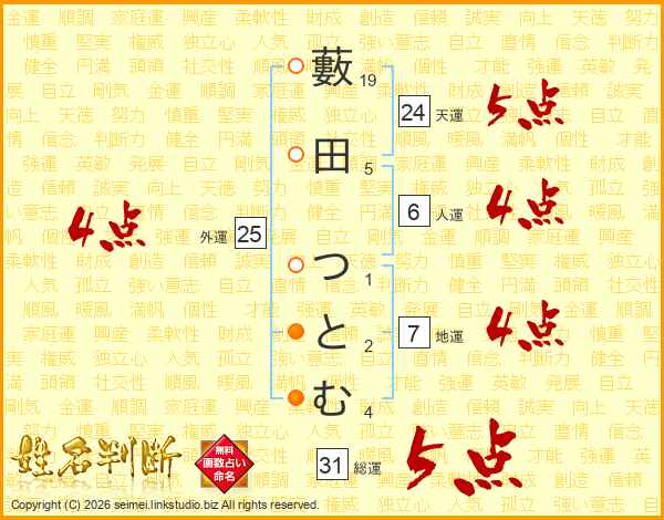 生活面を象徴する運勢です。外部から受ける影響力を表し、結婚運、家庭運や職場、環境への順応性を表します。総運から人運を引いた画数。姓や名が1文字の場合を除く。